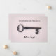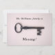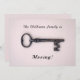 Mostra uma chave esquelética antiga sobre um fundo rosa. O texto inicial diz "A família Williams está se movendo!" e pode ser personalizado. As informações de contato na parte traseira podem ser alteradas para seu novo endereço. Design mínima, limpa e feminina. Para mudar para uma nova casa, com seu novo endereço, telefone, número e outras informações de contato.