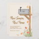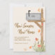 Este cartão de lançamento em movimento do outono apresenta uma caixa de correio de cor d'água e folhas de outono em um plano de fundo creme. Diz "New Season New Home" na tipografia da na moda. Facilmente personalizável com seu novo endereço e número de casa na caixa de correio. Original Watercolor © Michele Davies.
