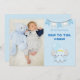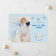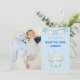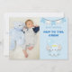 Anuncie a chegada do seu bebê precioso em estilo com sua foto à esquerda e a tipografia em azul à direita Nova para a Tripulação, que você pode facilmente mudar para suas próprias palavras se desejar, assim como os detalhes no verso. Um elefante bonito segurando um balão também está na frente, e bandeiras ao longo do topo, com um fundo azul pálido com um padrão estelar.
