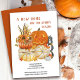 O anúncio comovente do Halloween. Diga feliz halloween e deixe todos saberem seu novo endereço ao mesmo tempo. Design de aquarela de fazenda russa em sexo neutro, cores ricas do outono de laranja queimada, ouro amarelo e cinza. A ilustração apresenta uma abóbora laranja com girassóis, jack ou lanterna e abóboras brancas em uma caixa de madeira de fazenda, decorada com folhas de outono e placa de varanda BOO. O lançamento é intitulado "Uma nova casa para a estação Spooky" e você pode personalizar o texto restante.