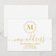 Celebre sua grande mudança com estilo com este elegante Cartão de Anúncio de Novo Endereço, apresentando uma coroa botânica dourada minimalista e design de monograma clássico. Personalizado com sua inicial e detalhes de contato atualizados, este cartão postal sofisticado é perfeito para informar amigos e familiares sobre seu novo endereço. Uma escolha moderna e elegante para casais, famílias ou indivíduos que começam um novo capítulo.