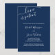 Cartão de anúncio de adiamento de casamento com paleta de cores azul naval e branco minimalista. "O amor é paciente", junto com os nomes da noiva e do noivo, é escrito à mão em letra cursiva elegante. O modelo é configurado para você personalizar a mensagem de atualização do seu casamento. A redação da amostra lê "devido a eventos recentes, o casamento de [seus nomes] foi adiado. Vamos informar assim que definirmos uma nova data. Foi uma decisão difícil e agradecemos a sua compreensão" - que você pode manter ou editar como desejar.