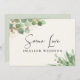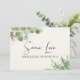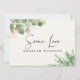 Se as circunstâncias exigirem que você reduza o tamanho e diminua o número de convidados em seu casamento, você pode informar sua lista original de convidados com este belo e moderno cartão de anúncio de casamento reduzido em creme claro, apresentando suaves aquarelas de folhas de eucalipto verde claro com detalhes em dourado e "Mesmo Amor, Casamento Menor" escrito em uma fonte estilosa e tipografia moderna na frente em creme claro. No verso em verde sálvia claro, você pode personalizar facilmente a mensagem de redução do casamento com mais detalhes e adicionar qualquer transmissão ao vivo da cerimônia, celebrações futuras e informações do site do casamento.