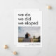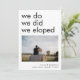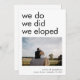 Estilo contemporâneo para que seus amigos saibam de seu elopemento com a tipografia moderna simplista, Nós Elografamos na frente em preto, abaixo do qual adicionamos sua foto favorita de seu casamento elopedista, e personalizamos seus nomes, e data e local de sua cerimônia. Por trás, personalize facilmente com seu anúncio. As cores do texto e do plano de fundo podem ser alteradas se você desejar por meio da opção Personalizar mais.