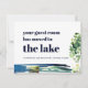 Se você está se mudando para um lago ou para a frente d'água, este novo cartão de endereço conta a história... com um lago, doca e árvore ao lado do lago. O texto à frente está em negrito azul-escuro tipografia (a cor da água) e diz "O seu quarto de hóspedes mudou-se para o lago." Você poderia mudar "lago" para "praia" e obter o mesmo efeito com seu texto. Todo o texto de exemplo na frente e na parte traseira do cartão pode ser facilmente revisado com sua saudação pessoal e detalhes de contato.