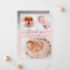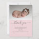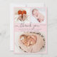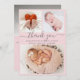 Anúncio De Cor Rosa Blush De Nascimento Obrigado Cartões De Colagem Fotográfica. Anúncio de nascimento elegante e minimalista apresentando 3 das suas fotos favoritas de bebês na frente, com um bonito texto escrito "obrigado você" em um roteiro suave de caligrafia com caudas de inchaço sobre fundo cor-de-rosa. Adicione o nome do seu bebê à frente e à natalidade. No verso há espaço para o seu obrigado que você manda e uma foto de bebê. Você pode personalizá-lo facilmente.