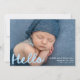 Seja bem-vinda a sua pequena com este doce e moderno anúncio de nascimento de fotos com a fotografia horizontal do seu bebê e a palavra "Olá" num guião manuscrito azul-céu alegre. Personalize a frente com o nome do seu bebê, data de nascimento e estatísticas de natalidade para uma introdução sentida. As costas incluem uma colagem de seis fotos quadradas com espaço abaixo para compartilhar os nomes de sua família — uma escolha encantadora e na moda, perfeita para celebrar meninos.