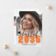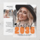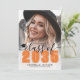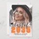 Classic Modern Graduation Announcement. The front features a full-page photo with a white gradient at the bottom that fades seamlessly into the image. Over the gradient, "2026" appears in a bold orange classic school-style font. Just above it, "Class of" is written in elegant black script. To the left of the year is a small, customizable graduation cap icon. Below the year, the graduate's name and school name are prominently displayed. All colors can be customized to match school colors or personal preferences.