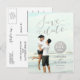 Efeito de Foto Impressa em Folha de Prata Glamour Manuscrito | Cartão Postal de Save the Date de Foto. Elke Clarke© Disponível em www.zazzle.com/monogramgallery. Design moderno minimalista de sobreposição de foto com as palavras "Save the Date" em escrita manuscrita prateada. Um ponto prateado para a data do casamento e texto cinza prateado para os nomes dos noivos e texto de informações do anúncio de casamento. Folha de prata é um efeito de foto impressa. Outras cores disponíveis em nossa loja.
