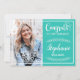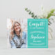 Cartão de anúncio de na moda e graduação moderna com uma grande foto personalizável no lado esquerdo com um texto branco sobreposto com o ano de aula, e um elegante fundo turquesa com texto branco que lê "Parabéns ao nosso formando" no lado direito. Facilmente personalizável editando o texto personalizado com o nome do formando e o ano de graduação.