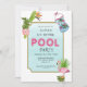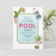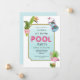 Convites de festas de Piscinas Tropicais Cutas, com piscinas de aquarela e folhagem tropical com folhas de palma e hibisco, maiô e flamingo perfeitos para o Aniversário, Graduação ou qualquer outra festa de piscina de Verão