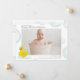 Foto de bebê cercada por bolhas com pata de borracha no fundo.