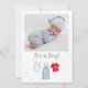 Celebre a chegada do seu pequeno com este anúncio Fotográfico de "It's Boy baby" com um design de aquarela giro e caprichoso. Os tons azuis suaves e a charmosa arte da linha de tecido criam o pano de fundo perfeito para a sua fotografia de recém-nascido. Com os seus sotaques azuis e detalhes lúdicos, este anúncio de um bebê é uma maneira emocionante de compartilhar sua alegria com amigos e familiares.