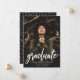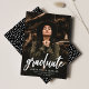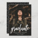 Anúncio de graduação simples que apresenta a foto do formando com "formando" em uma fonte de script tradicional branco. Personalize a frente do anúncio de graduação de fotos adicionando o nome do formando, o nome da escola e o ano de graduação. O anúncio é revertido para exibir um padrão de aspersão branca com um fundo preto ou cor de sua escolha.