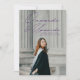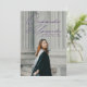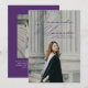 Anúncio de graduação moderno com a foto vertical do formando com "Para frente e para cima" em um roteiro manuscrito roxo. Personalize a frente do anúncio de graduação de fotos adicionando o nome do formando, a escola e o ano de graduação. O anúncio é revertido para exibir uma foto adicional com os planos futuros do formando, detalhes da parte do formando, etc. mostrados abaixo.