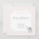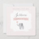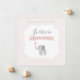 Cartão de anúncio de nascimento para uma garotinha com um elefante fofo e um coração, letras de mão e um padrão de cóvulo.