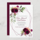 Convites de casamento de flores coloridas e românticas, incluindo peônias e anêmonas em burgundy, rosa, pêssego e marsala com folhagens e penas combinando sobre uma moldura de arame geométrica. Os modelos de texto são fáceis de personalizar com suas próprias informações. Se precisar de ajuda, por favor envie um e-mail para shutterbug600@yahoo.com