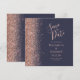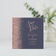 A borda esquerda deste elegante casamento moderno salve o cartão de data apresenta um rosa dourado falso borda brilhante. O texto personalizável combina a letra rosa-rosa, a letra copperplate e a letra itálico num fundo azul escuro. O verso apresenta um design azul escuro e rosa dourado correspondente.