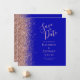 A borda esquerda deste elegante casamento moderno salve o cartão de data apresenta um rosa dourado falso borda brilhante. O texto personalizável combina manuscrito pálido de cor azul-pincelada, manuscrito e fontes itálicas em um fundo azul real. O verso apresenta um design real azul e rosa dourado correspondente.