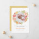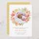 Cartão de modelo de anúncio de nascimento elegante com ilustrações florais de rosas cor-de-rosa, lavanda, fruta de citrinos cor de laranja e folhagem verde na frente. O verso revela um fundo bolinhas amarelo. Na frente, uma foto do seu recém-nascido que pode ser adicionada a esta placa. Use uma imagem de tamanho quadrado para facilitar o ajustado. O papel tem belas bordas redondas. Cartão perfeito para anunciar a chegada do seu novo bebê com as estatísticas de nascimento. Excelente para o bebê e para a menina. Perfeito para as estações de verão e primavera!