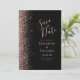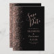 A borda esquerda deste elegante casamento moderno salve o cartão de data apresenta um rosa dourado falso borda brilhante. O texto personalizável combina fontes coloridas de cor azul-rosa pálidas, copperplate e itálico em um plano de fundo preto. O verso apresenta um design preto e rosa dourado correspondente.