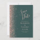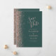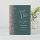 A borda esquerda deste elegante casamento moderno salve o cartão de data apresenta um rosa dourado falso borda brilhante. O texto personalizável combina manuscrito pálido de cor azul-pincel rosa, fontes copperplate e itálico em um fundo verde-escuro. O verso apresenta um design verde e rosa dourado correspondente.