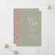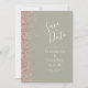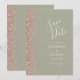 A borda esquerda deste elegante casamento moderno salve o cartão de data apresenta um rosa dourado falso borda brilhante. O texto personalizável combina manuscrito de marfim, fontes em copperplate e itálico em um fundo verde de sábio. O verso apresenta um design verde-sábio e rosa dourado correspondente.