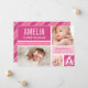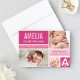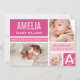 Anuncie o nascimento da sua menina com este cartão de anúncio de nascimento em cores vibrantes e modernas. Três fotos do seu recém-nascido são exibidas em um layout de colagem vibrante com blocos rosa forte, rosa claro e branco, com um destaque de faixa diagonal e uma inicial de monograma grande. O nome do bebê, data de nascimento, hora, peso e altura são exibidos de forma destacada ao lado de uma mensagem dos pais orgulhosos. Todo o texto, cores e fotos são totalmente personalizáveis.