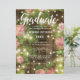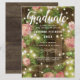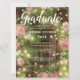Envie a sua família e amigos um anúncio elegante de graduação com um tema de jardim rústico com rosas cor-de-rosa e luzes de cordas com uma cerca de madeira no fundo, acentuada por luzes de cordas. A tipografia está na escrita moderna e em fontes simples para você personalizar com todos os seus detalhes de graduação. A parte de trás do cartão é madeira rústica de meteoros. Concebido pelo artista mundialmente famoso ©Tim Coffey.