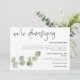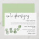 Para ocasiões em que uma cerimônia de casamento menor e socialmente distante é essencial e você precisa desconvocar alguns convidados e pedir que eles se juntem à transmissão ao vivo, este design contemporâneo tem um ramo elegante de folhas de eucalipto no canto inferior esquerdo e uma fonte estilosa de letra manuscrita moderna com "Estamos Reduzindo o Número de Convidados" no topo. O resto do texto, que está alinhado à direita, você pode personalizar facilmente com seus detalhes. Você também pode alterar a cor de fundo verde coordenada na parte de trás para outra cor, se desejar, através da opção "Personalizar Mais".