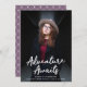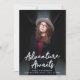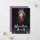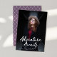 Anúncios de graduação de tendências que apresentam a foto vertical do formando com "Aguardas de Aventura" em letra branca de script manuscrito. Personalize a frente dos anúncios de graduação da Adventure Aguarda o nome do formando, o nome da escola e o ano de graduação. O anúncio se reverte para exibir um elegante padrão de girino roxo e branco.