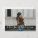 Anúncio de graduação elegante com a foto horizontal do formando e o nome do formando em uma cobertura branca de script de caligrafia. Personalize o anúncio de graduação de fotos, adicionando o nome da escola e o ano de graduação. O anúncio inverte para exibir um padrão de lista branca e fundo roxo.