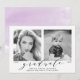 Nossos anúncios de fotos de graduação "Agora e Depois" na na moda mostram a foto favorita do seu mais velho (agora) assim como uma foto de bebê ou criança (então). Alterar os anos abaixo de cada foto para refletir o ano de graduação e o ano de nascimento (ou a foto do ano foi tirada). Os modernos anúncios de graduação exibem "formando" em uma letra elegante com o nome do formando, o nome da escola e o ano de classe abaixo. O verso do anúncio de formando apresenta um plano de fundo de aquarela roxo suave. Adicione uma foto ou texto ao fundo para obter um design mais personalizado!