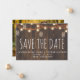 Rustic Fall Lights & Leaves Save the Date Announement Postcard - com luzes de jarro de mason cheias de pirilampos cintilantes com planície de folhas folheadas num fundo de madeira de celeiro. Uma foto do casal feliz aparece na parte traseira da placa. O anúncio perfeito de "Salve a data" para o casal que ama o estilo rústico. Salvar a Data fará parte de uma coleção.