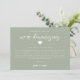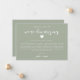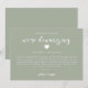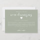 Cartão de atualização de casamento simples e moderno com design verde sage e texto em script que diz "estamos reduzindo" com um coração. O cartão explica como foi uma decisão difícil, mas necessária para priorizar a saúde e o bem-estar dos convidados.