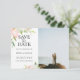 Flores de aquarela suave e folhagem botânica, cartão de salvar data de casamento com foto. O cartão apresenta hidrangeas brancas, peônias rosa desmaiado e folhagem verde. O verso do cartão, mostrado em rosa pétala, pode ser personalizado. Projetado para combinar com nossa coleção de casamento Graceful Garden.