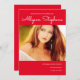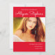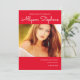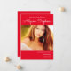 Design de anúncio de graduação vermelha simples e clássica apresentando um solteiro grande fotográfico na frente com seu nome no topo e na escola e classe embaixo em texto branco. Excelente para segundo grau ou formandos.
