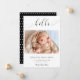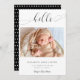 "Alô" em letra elegante de escrita com baloiços de rico. Um anúncio simples e elegante de nascimento de um bebê fotográfico. Um olhar moderno, minimalista e limpo. O verso tem um padrão de bolinhas fofo.