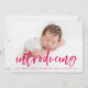 Cartão de anúncio de nascimento de foto moderno que apresenta a foto horizontal do recém-nascido do seu bebê com "apresentação" apresentada numa cobertura de escrita de pincel magenta. Personalize a frente dos simples anúncios de nascimento com o nome do bebê e as estatísticas de nascimento. A placa reverte para exibir um fundo magenta sólido com espaço para fotos e texto adicionais.