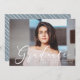 Anuncie sua conquista especial do formando com nossos anúncios de graduação do Momentous Script. Os anúncios de graduação em na moda apresentam uma fonte moderna de script de caligrafia que sobrepõe a foto favorita do mais velho do formando. Personalize os modernos anúncios de graduação com o nome do formando, o nome da escola e o ano de graduação. O verso do anúncio apresenta um fundo estriado diagonal desenhado à mão em azul ardente.