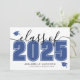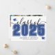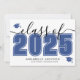 Um anúncio de formatura horizontal clássico, porém moderno. A frente apresenta um "2025" superdimensionado em azul negrito com "Turma de" em preto elegante, acentuado por uma escrita cursiva preta. Dois ícones de boina de formatura azuis adicionam um toque comemorativo, com espaço abaixo para o nome do formando e da escola. As cores podem ser personalizadas para combinar com as cores da escola para um visual personalizado.