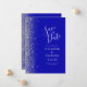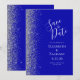 A borda esquerda deste elegante casamento moderno salve o cartão de data apresenta uma borda cintilante. O texto personalizável combina manuscrito branco, fontes em copperplate e itálico em um fundo azul real. O verso apresenta um design azul e prateado correspondentes.