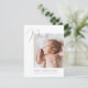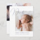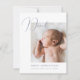 Na frente, este simples e na moda, modelo de anúncio de nascimento de fotos, simples, mostra o nome do seu bebê com detalhes abaixo da sua foto, juntamente com o nome do seu bebê, em um roteiro caloroso e expressivo, próximo ao topo da carta, que se sobrepõe parcialmente à foto. Se preferir uma aparência mais minimalista, você pode excluir sem substituir nenhuma de nossas estatísticas de amostra na frente - talvez não queira incluir a hora do dia ou a duração, por exemplo. E o comprimento do nome do seu bebê acima das estatísticas também pode levá-lo a deixar de fora algumas das estatísticas para conseguir uma aparência equilibrada entre as duas linhas de texto, etc. E por falar em equilíbrio, você pode decidir fazer um pouco do texto da frente maior ou menor. A cor padrão para o texto em ambos os lados da placa é uma elegante sombra escura de azul. Mas você pode mudar isso para qualquer cor que se ajuste ao seu estilo. Também incluímos espaço para uma foto no verso. Você pode optar por alterar a fonte, a pontuação ou a cor usada para vários elementos de texto deste design na frente e/ou no verso. Escolhemos os cantos nítidos padrão como a forma padrão, mas você pode facilmente mudar isso para cantos arredondados, pois essa aparência também funciona muito bem com esta design. Então, verifique os dois estilos e veja qual deles te agarra! O plano de fundo padrão em ambos os lados é definido como transparente para permitir que a cor do papel sirva simplesmente como tom base. Mas você pode facilmente mudar isso selecionando uma das cores básicas nas ferramentas de edição, inserindo outro número de cor no lugar da nossa, se você tiver uma matiz específica em sua pesquisa, ou olhando para a ferramenta do espectro de cores e escolhendo algo à vista. Colocamos algum texto de marcador de posição no verso para que você exclua e substitua por sua própria mensagem, com ou sem seus nomes, se você quiser assinar manualmente quando receber os cartões. Mas você pode simplesmente optar por excluir nosso texto de marcador de posição e deixar o vazio de trás completamente para que você possa escrever uma mensagem manualmente em cada cartão e assinar seus nomes. O tipo de papel padrão, matte, tem um calor suave e resiste a manobras, então é uma escolha excelente para escrevendo sua própria mensagem. Em vez disso, você pode editar isso e escolher semirdano ou outro tipo de papel. Em qualquer caso, lembre-se de que há uma segunda foto, assim como um texto de marcador de posição, também no verso, e apague todo o texto de amostra/marcador de posição em ambos os lados do cartão e substitua ambas as fotos de amostra pela sua. Use as ferramentas intuitivas de design, suas fotos favoritas e sua inspiração para fazer com que este cartão moderno de nascimento chic seja exclusivamente seu. Temos uma seleção de outros anúncios de chegada de bebês na moda, por isso, por favor, procurem mais ideias na nossa loja!