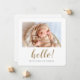 Esta simples carta de anúncio de nascimento de na moda, com uma placa plana, apresenta um aspecto contemporâneo que é igualmente adequado para raparigas e rapazes. Escolhemos cantos arredondados como a configuração padrão de forma, mas você pode facilmente mudar a aparência para cantos agudos, pois essa aparência também funciona maravilhosamente com esta design. Abaixo da sua foto nós adicionamos um simples 'olá!' em todas as minúsculas em uma escrita moderna e relaxada. Nós o destacamos por fazer um tom de ouro elegante que às vezes é chamado de Califórnia Dourada. Este elemento do design não pode ser alterado. O nome na frente abaixo que está na cinza escura, mas quando você edita nosso texto de amostra para mostrar o nome do seu bebê, você também pode facilmente mudar essa cor e fonte do texto para se adequar ao seu estilo. Nós definimos o plano de fundo de ambos os lados como transparente, para que a cor do seu papel sirva simplesmente como o tom base. Você pode mudar isso em um ou em ambos os lados escolhendo uma cor. Nas costas, incluímos um lugar para o nome do cheio do seu bebê novamente, também no tom de ouro que usamos para 'olá!' na frente. Quando você edita isso para mostrar o nome do seu bebê, você pode decidir alterar a cor deste texto. As estatísticas abaixo que estão definidas como cinzas, mas você também pode alterar a cor e a fonte disso. Finalmente, na parte inferior atrás, adicionamos uma linha no script com uma mensagem de boas-vindas e seus nomes. Isso também pode ser editado para cores e fontes de acordo com o seu estilo, e é claro que você pode mudar o texto também. Em qualquer caso, lembre-se de remover todo o espaço reservado e texto de amostra em ambos os lados, assim como nossa foto de amostra! O tipo de papel padrão, matte, tem um calor suave para ele e resiste a manobras, então é uma escolha excelente para escrevendo sua própria mensagem se você optar por excluir algum ou todo o texto de amostra no retorno sem substituí-lo pelo seu. Ou você pode mudar o tipo de papel para semibrilho ou um dos outros estilos adoráveis do zazzle. Use as ferramentas intuitivas de design, sua foto favorita e sua inspiração para personalizar esta placa plana de anúncio de nascimento personalizada e torná-la exclusivamente sua!