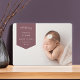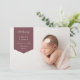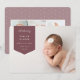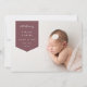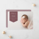 O simples anúncio de nascimento moderno apresenta uma foto horizontal ou paisagística de sangramento de cheio com uma faixa pontiaguda no canto superior esquerdo, com o nome do bebê, data de nascimento e estatísticas de natalidade. Adicione uma mensagem pessoal ao verso, juntamente com três fotos quadradas adicionais.
