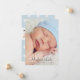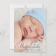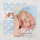 Simplesmente adorável cartão de anúncio de nascimento com foto apresenta o nome do bebê menino em elegante caligrafia com estatísticas de nascimento em cinza carvão sobrepondo uma foto de retrato em bleed total. O verso apresenta uma faixa de colagem de três fotos em um padrão de bolinhas azul bebê e branco com uma mensagem "Com Amor, Pais Orgulhosos". Todas as cores do texto e o fundo de bolinhas são totalmente personalizáveis.