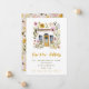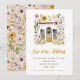 Announce your summer house move with is colorful new address/new home announcement with a watercolor illustration of a mustard yellow from door surrounded by mustard yellow and pink flowers and greenery.