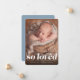 Tão amado! Se você está introduzindo um novo bebê de alegria neste Dia de os namorados, este cartão vertical de uma foto define o tom perfeito. Com seu texto simples no fundo da foto, esse anúncio de nascimento tem bastante espaço para uma introdução, nomes e todas as estatísticas. A parte de trás é azul claro com pequenos pontos brancos, mas a cor pode ser alterada clicando em "personalizar mais".