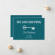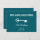 Modern and stylish "We Are Moving" announcement on a rich teal background, featuring a vintage skeleton key graphic. Share your new address with an elegant, streamlined design.