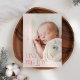 Cartão de nascimento elegante e moderno, tema do Natal, com um texto tipográfico que diz "pequenos dedos grandes alegria". Este é um cartão de anúncio de nascimento para as férias! Adicione suas fotos, estatísticas de natalidade e uma mensagem! O fundo é pêssego.